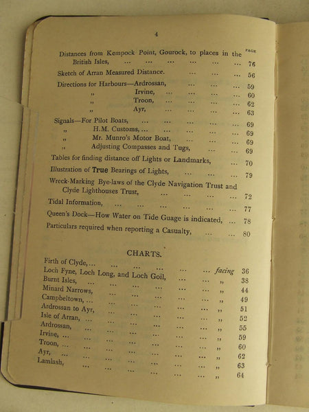 80 pages + addenda page correcting the handbook to January 31st 1931. illustrated with charts and with a multifold coloured plan of Glasgow Harbour and Docks.