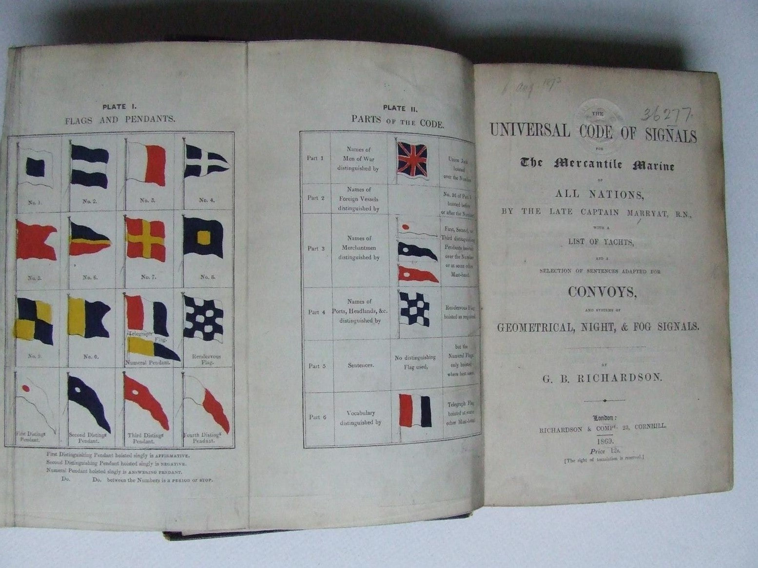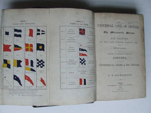 comprises Signals of English Men-of-War, [Foreign Men-of-War cannot be continued as the list of the French Navy is no longer published], Merchant Vessels by distinguishing pennants, Lighthouses - with their latitude, longitude and character of light; Ports, Headlands, Harbours, etc. Collection of Sentences, Convoy Signals, Sentences for vessels meeting at sea, Vocabulary, etc.